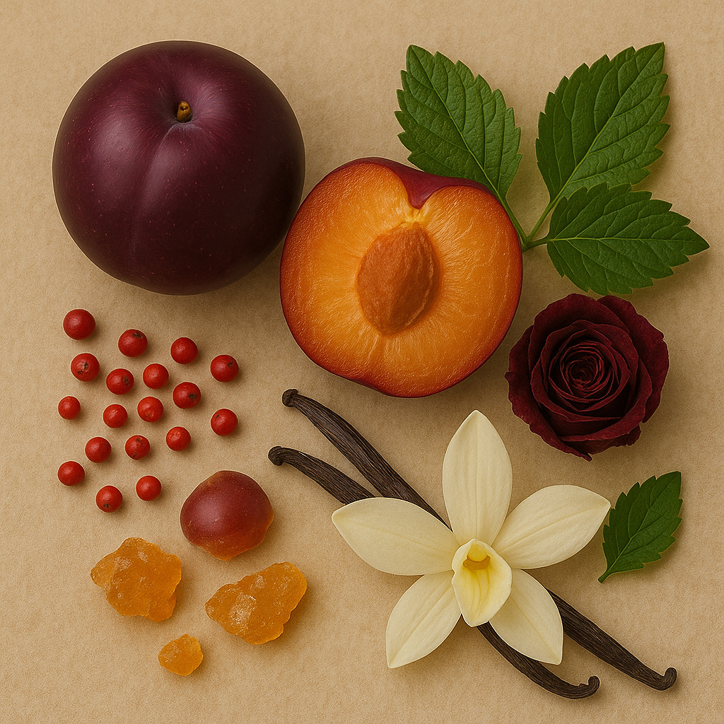 Cover yourself in the delicate scent of plum, peppercorn, patchouli, dark rose, amber, and vanilla.