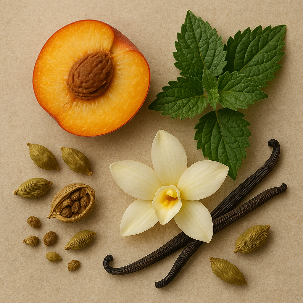 Cover yourself in the delicate scent of juicy peach, cardamom, patchouli and vanilla.